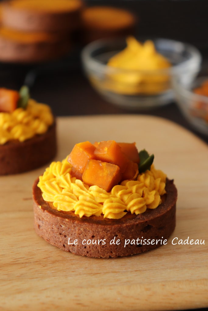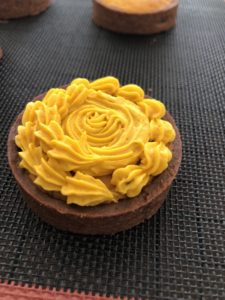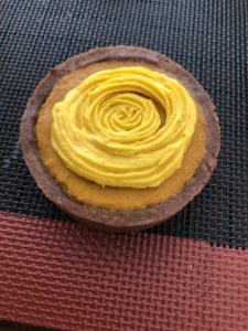 タルトレットの中心にかぼちゃクリームを薄く絞る。